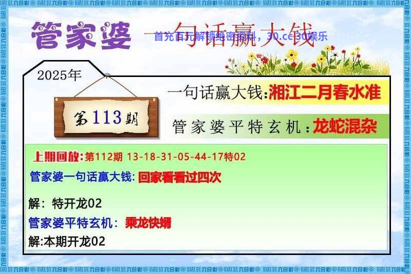 | 113期【精解管家婆一句话】 【湘江二月春水准】【龙蛇混杂】 解:湘江二月春水准,阴肖:鼠猪狗马蛇龙 综合取肖:鼠猪狗马蛇龙 本期取码:30.42.07.31.08.20.12.48.13.25.02.14 本期平特:蛇蛇蛇  |